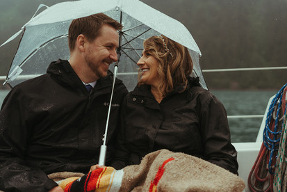 We took some more amazing photos on the sailboat to celebrate the happy couple. Jen came prepared with her rain boots, and we had umbrellas, coats and a cozy blanket to stay warm as we sailed into the cove. Once we docked, we took a few more photos until the helicopter arrived!